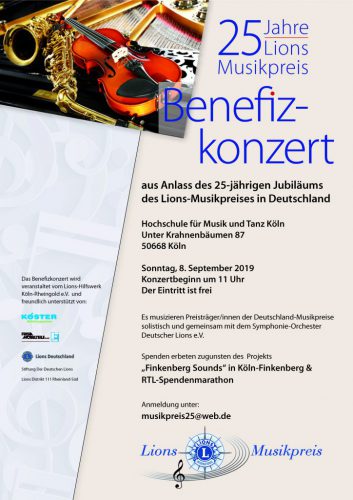 Hochschule für Musik und Tanz Unter Krahnenbäumen 87, KölnUnter der Schirmherrschaft von Frau Oberbürgermeisterin Henriette Reker findet am 8. September 2019 ein Benefizkonzert in der Hochschule für Musik und Tanz Köln statt. Anlass ist das 25-jährige Jubiläum des Lions-Musikpreises. Der Eintritt ist frei, Spenden werden zugunsten des Projekts „Finkenberg Sounds“ sowie für den RTL-Spendenmarathon erbeten. Wir laden Sie herzlich ein!